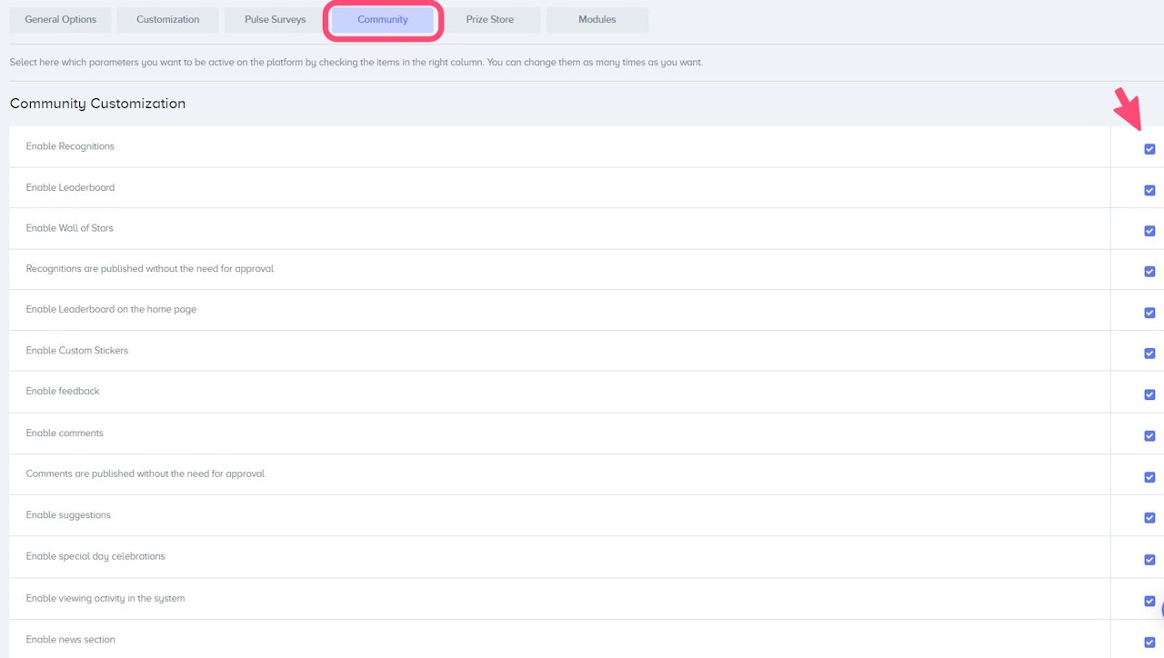 In that section, you can enable or disable the areas you want to use in the community, as well as configure whether system administrators should or should not publish Recognitions and Comments.